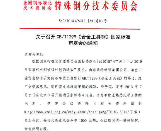 关于召开GBT1299《合金工具钢》国家标准审定会的通知