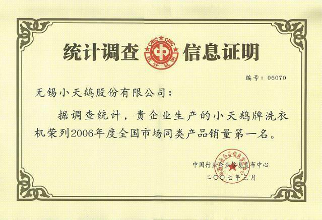 国家统计局中国行业企业信息发布中心3月18日在北京人民大会堂召开“品牌与社会责任高层论坛”,并发布全国重点消费品市场2006年度调查结果。调查结果显示,2006年小天鹅洗衣机销量达510万多台,名列全国销量第一,市场占有率达25.32%。至此,小天鹅洗衣机已连续十一年保持全国销量第一。小天鹅股份有限公司总经理柴新建、总经理助理卞扬林出席会议,并接受有关领导颁发的证书和奖牌。