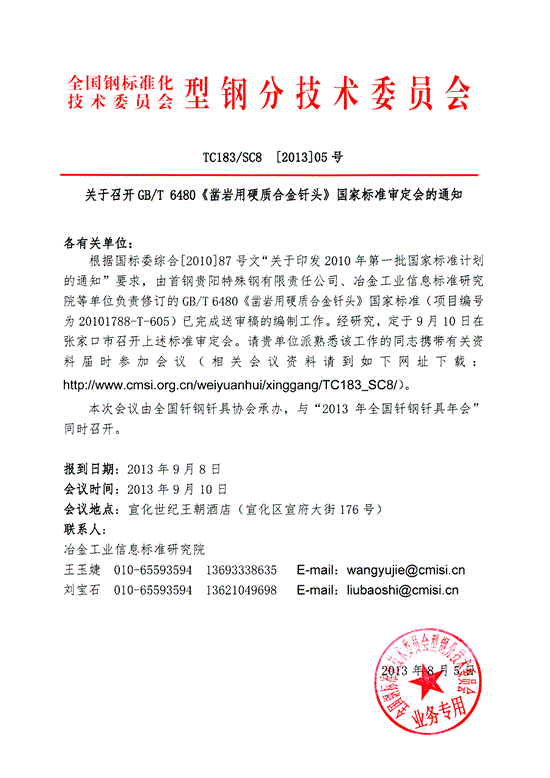 召开《凿岩用硬质合金钎头》国家标准审定会通知