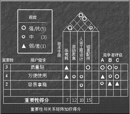 质量屋(the House of Quality)一直是产品开发中连接用户需求与产品属性的经典工具。例如在一个相机产品开中,市场研究得到了用户对产品的若干需求,如,质量轻、使用方便、可靠、容易拿稳等等。通过市场人员与设计人员共同工作,确定实现不同需求可行的方式。这个过程同时排除掉了一些目前技术无法实现的需求,就像选择家具。一个完整的质量屋,还包括竞争对手表现、技术指标之间的关系、技术指标重要性得分等信息。