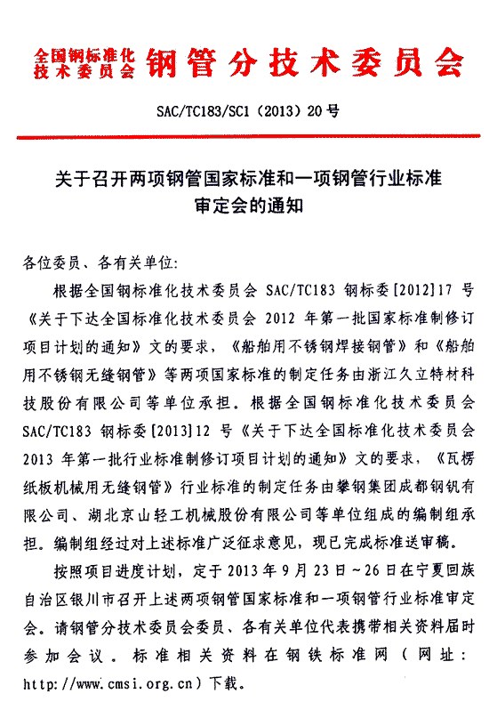 关于召开两项钢管国家标准和一项钢管行业标准审定会的通知