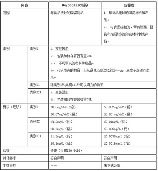 10月18日,欧盟委员会制定新提案,拟加强与食品接触的陶瓷制品的范围和要求,包括与食品接触的陶瓷制品中的铅和镉溶出量的新限值,具体要求详见下表。新措施将纳入与食品接触材料和物品条例(EC) No 1935/2004第(5)条款下,取代现行84/500/EEC指令。