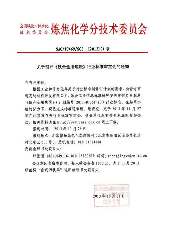 关于召开《铁合金用焦炭》行业标准审定会的通知