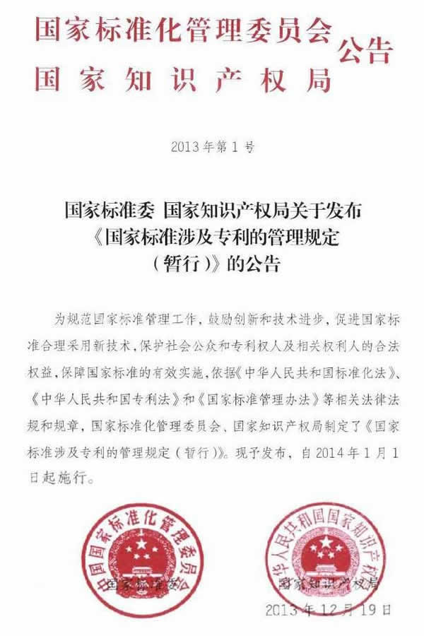 《国家标准涉及专利的管理规定(暂行)》发布公告