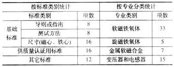 从IEC/TC51最新公布的标准信息中得知,IEC/TC51现行有效出版物有60项(包括补充修改单)。按标准类别和专业分类统计见表1。可以看出,多年来,IEC/TC51一直是从基础标准编制出发,以制定软磁磁心、铁心的基础标准为主流,逐渐向通用元器件、新型元器件标准方向发展的。
