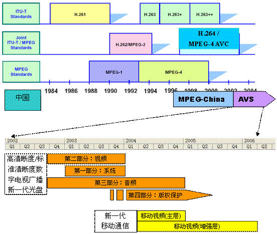 在国家标准计划中,AVS标准的正式名称为《信息技术 先进音视频编码》。AVS标准包括系统、视频、音频、数字版权管理等四个主要技术标准和一致性测试等支撑标准。AVS标准和相关国际标准的时间对应关系以及AVS工作组已经开展的工作如下图所示。