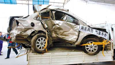 襄樊市一位车主拖着被撞坏后安全气囊没有打开造成车毁人亡的汽车,为自己讨说法。IC/供图