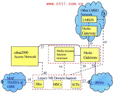 网络中引入了LMSDS实体、媒体网关(MGW)和媒体资源功能处理实体(MRFP)。LMSDS实体包括原LMSD中的HLR,MSC和SCP功能,分别称为HLR模拟器(emulation)、MSC模拟器(emulation)和SCP模拟器(emulation)。LMSDS的功能主要包括传统电路域业务的控制和管理,并且需要支持ANSI-41网络信令(MAP),PSTN网络信令(ISUP),媒体网关信令(MEGACO),MRF处理信令(MEGACO),无线接入网络信令(IOS-A1)和LMSDS IP呼叫建立信令(SIP-T)接口。