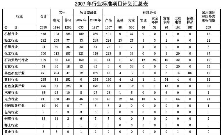 为做好2007年行业标准修订工作,国家发改委今天发布了《关于印发2007年行业标准修订、制定计划的通知》,《通知》将2007年行业标准项目计划印发给各行业协会,并请尽快转发到有关标准化技术委员会和标准起草单位,抓紧落实,按时完成计划。今年如有新的急需制定的标准,将另行补充通知。