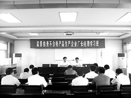 13家产品不合格企业的厂长(经理)近日被邹平县质监局“请进门”,参加2007年上半年省、市级监督抽查不合格产品企业厂长(经理)学习班。 这次学习班的宗旨,是强化企业负责人是产品质量第一责任人的意识,鞭策企业树立质量兴企观念,为消费者提供安全放心产品。本次培训班系统学习了《产品质量法》、《食品生产加工企业质量安全监督管理实施细则》等法律法规,分析了不合格项目原因,要求企业限期按时整改、复查,完成整治要求,生产出让政府放心、群众满意的合格食品。图为培训班现场。