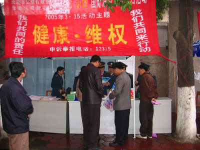昨天,在细雨霏霏中,迎来了今年3·15国际消费者权益日,北流市消费者协会联合工商行政管理、食品药品监督、技术质量监督等监管职能部门以及中国电信北流分公司等企业共10多个单位,在城区陵宁路街道两旁设立宣传询旬服务点,紧密围绕“健康·维权”主题,向过往群众宣传咨询与消费者生命健康权息息相关的《消法》、《产品质量法》、《食品卫生法》等法律法规、商品和服务知识等,发放各种宣传资料近20000份,深受广大消费者的欢迎。 (陈耀强)