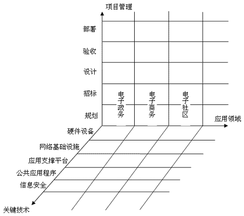 在这个信息化标准的三维空间,关键技术为信息化建设提供了主要技术手段并直接反映了信息产业的发展水平,项目管理为信息化建设提供了科学的管理模式,而应用领域则是利用关键技术和项目管理等技术管理手段而开展的具体信息化工程项目。