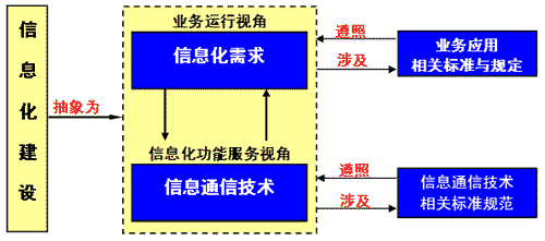 业务运行视角主要从信息化建设需求的角度出发来提出各种信息化功能要求,该视角将以各业务应用(如电子政务、电子商务、企业信息化、电子社区等)为重点由业务管理部门为主体来研究相关业务规范和规定。信息化功能服务视角主要从提供信息化功能服务的角度出发来归纳出支持信息化功能要求的信息化基础手段(即信息通信技术),该视角将以各种信息通信技术为重点由信息通信技术供应商为主体来研究制定相关技术标准规范。新的信息化需求是促进信息通信技术创新的原动力,而新兴的信息通信技术进而推动着各种业务应用管理模式创新的发展,信息化水平就是在这种互为促进的过程中不断提升的。信息化标准体系的研究应是业务应用部门(即信息化建设的需求方)和信息通信技术供应方(即信息化建设的实施方)共同参与的。但是,目前人们往往过于关注信息通信技术标准规范(即技术规范)的研究,而忽视了业务应用相关标准的研究,从而制约了信息化建设的发展。