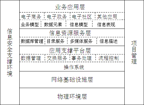 由于信息化建设是一项涉及面非常广泛的社会系统工程,将涉及大量的标准和规范,因此必须对这些标准和规范按照内在联系进行有序地整理,最终形成一套完整的信息化标准体系。为了便于人们更好地理解信息化标准体系框架中各类标准之间的相互关系,这里根据信息化建设的特点并结合信息化标准体系研究的技术参考模型,将复杂信息系统抽象为信息化标准体系研究的逻辑模型,如图3所示。该模型结构分为七个部分:业务应用层、信息资源服务层、应用支撑平台层、网络基础设施层、物理环境层、信息安全支撑环境及项目管理。这种逻辑结构便于对具体的信息化建设任务进行分解,也有助于信息系统建设的统筹规划和分步实施。