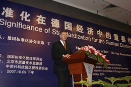 为推动北京企业充分认识标准对促进企业发展的作用,提升重点产业的综合竞争力,国家标准化管理委员会刘平均主任特邀请德国标准化协会主席巴克先生于10月9日来访,并安排下午在北京会议中心举办了“标准化在德国经济中的重要性”的技术讲座。来自北京市重点企业、中关村科技园区各园管委、各区县质量技术监督局以及国家标准委有关部门、中国标准化研究院、标准出版社、北京市质量技术监督信息研究所等单位共计350余人参加了本次讲座。