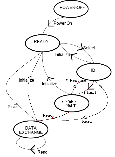 根据要求,需要增加的命令序列有Halt,Restore.使用这两个命令组合,卡片可以从ID状态切换到CardHalt状态,也可以从CardHalt状态切换到ID状态。利用该状态,方便确定并校对接收到的卡号的正确性。