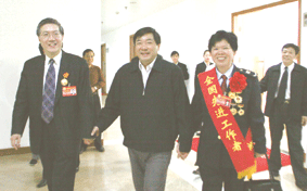 4月30日下午,刚刚参加完2005年全国劳动模范和先进工作者表彰大会的全国先进工作者陈钢、郭琼霞胸佩勋章,载誉归来。国家质检总局党组书记李传卿,副局长葛志荣、蒲长城,局党组成员郭汝斌、李忠海、宋明昌、夏红民,亲切接见了他们。