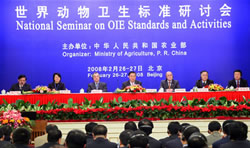 2月26日,由农业部主办的世界动物卫生标准研讨会在北京举行。这是中国自2007年5月正式恢复在世界动物卫生组织(OIE)合法权利以来,首次举办世界动物卫生有关标准和规则研讨会,是近年来中国与OIE进一步深化交流与合作,加强国际重大动物疫病防控的一次重要活动。农业部副部长尹成杰、OIE主席巴里·奥尼尔、总干事伯纳德·瓦拉特出席研讨会并致辞。