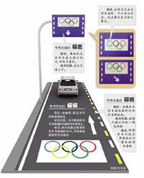 专用车道的标识由白底、奥运五环彩色图案组成,用于奥林匹克专用车道的交通标志和路面上。 (毛京东制图)