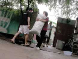 下午1点40分,一辆白色面包车开到院门口。工人们开始忙着将已经煮好的粽子装到一个个塑料编织袋里。由于装运都是在露天进行,许多塑料袋都沾染上了泥水。但工人们毫不在乎,直接就将塑料袋抱进面包车。