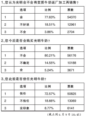据记者了解,光明牛奶的北京终端市场没受太大影响。这与网上“民意调查”的结果不太一样,在接受新浪网调查时,有约80%的网民表示不愿再购买光明奶。