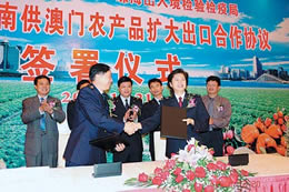 2007年12月21日,海南检验检疫局局长李小幼(前右)与珠海检验检疫局局长陈博文(前左)签署《关于共同促进海南供澳门农产品扩大出口合作协议》后互致祝贺。