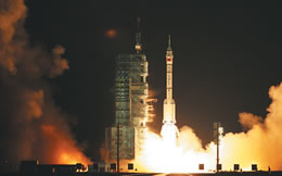 北京时间9月25日21时10分许,中国第三艘载人飞船神舟七号在酒泉卫星发射中心由长征二号F运载火箭成功发射升空。 孙自法 摄