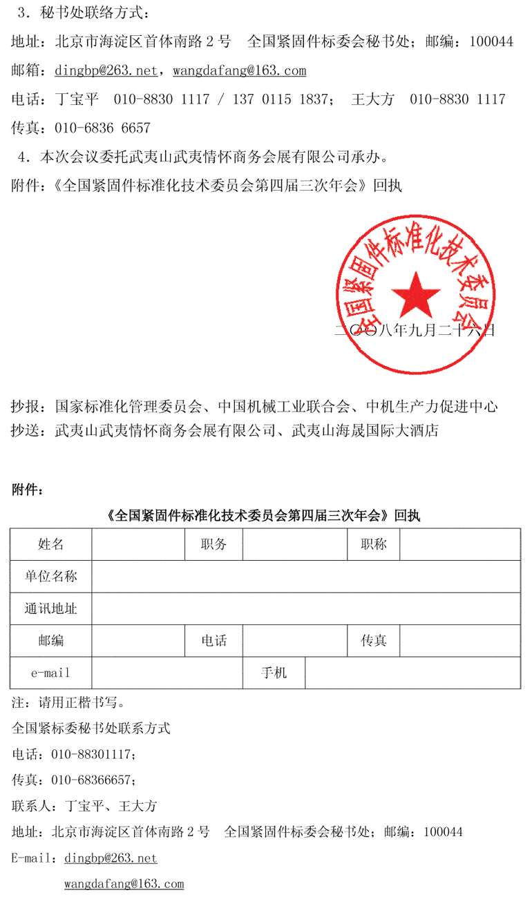 关于召开《全国紧固件标准化技术委员会第四届三次年会》的通知