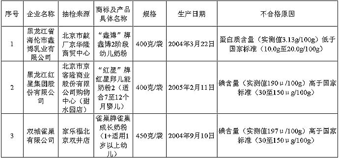 北京市场不合格婴幼儿奶粉及批次