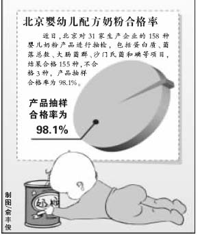 北京市工商局发布的质量抽检结果显示,北京婴幼儿配方奶粉整体合格率为98.1%.这是对北京市场的158种婴儿奶粉进行了抽检后,得出的结果。碘超标和蛋白质含量低于国家标准是造成产品不合格的两个因素。