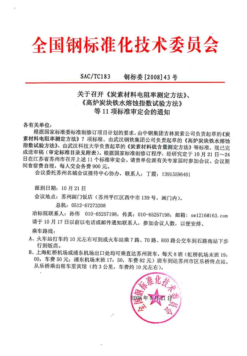 钢标委通知召开《炭素材料电阻率测定方法》等标准审定会