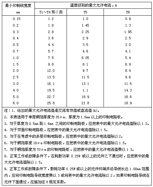 对于厚度不小于0.5mm印制电路板,在单面或双面具有厚度不小于35m的导电印制线时,如果其宽度为0.3mm,持续电流不大于0.518A,应给出的温度组别为T4或Ⅰ类。同样,对于最小印制线宽度为0.5mm、1.0mm和2.0mm,T4组分别给出了对应的最大电流为0.814A、1.388A和2.222A.印制线长度不大于l0mm,可不考虑温度组别。