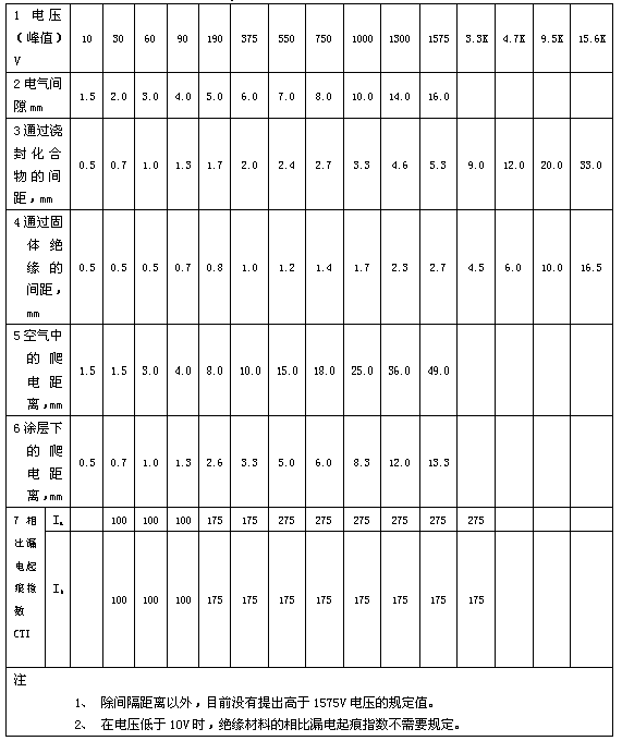 等效电气间隙=实际电气间隙+(3×通过浇封的任一附加间距)+(6×通过固体绝缘的任一附加间距)。为了可靠,上述结果应不小于表4规定的电气间隙值。任何电气间隙或间距,在小于表4相应规定值的1/3时,可以忽略不计。