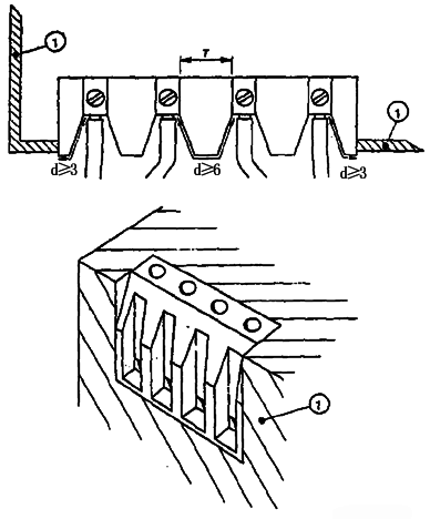 在连接装置带有接地电路并且接地电路与该防爆型式有关时,对于“ia”等级电路,连接装置应由三个完全独立的连接元件组成;对于“ib”等级电路,连接装置应由两个完全独立的连接元件组成(见图2)。该连接元件应是并联连接的。当连接装置可能转动一个角度时,则在连接装置各端的正中或边缘处存在一个连接。