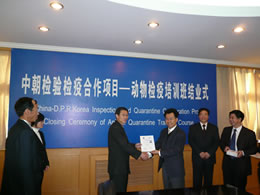 2008年11月21日,中朝检验检疫项目动物检疫培训结业典礼在中国检验检疫科学院举行。质检总局动植物检疫监管司卢厚林副司长、检科院李怀林院长、陈洪俊副院长参加结业典礼并讲话。朝鲜国家质量监督局进出口检验检疫司副司长Kil Ryon Su代表学员致辞。