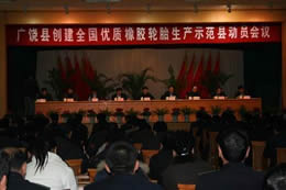 首先广饶县高良文副县长代表县政府做了动员讲话,他号召全县相关部门、企业统一思想,提高认识,迅速掀起“创建全国优质橡胶轮胎生产示范县”的热潮,突出重点,真抓实干,加强领导,齐抓共建,争取顺利实现创建全国优质橡胶轮胎生产示范县的工作目标。山东金宇轮胎有限公司代表企业进行发言。接着,东营市曹连杰副市长做了重要讲话,他指出,创建全国优质橡胶轮胎生产示范县活动是落实科学发展观的必然要求,是加快黄河三角洲开发建设的重要举措,是提升轮胎产品市场竞争力的有力保障,是积极应对全球经济危机的有效措施。省质监局王殿华副局长表示,省局将会对创建全国优质橡胶轮胎生产示范县工作全力支持,创优工作必将提升橡胶轮胎产品质量,做大做强品牌经济,促进广饶县集群发展。