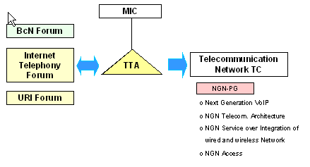 NGN相关的项目称为BcN(Broadband convergence Network),其主要目的是通过动态接入并利用基于IP的综合网络提供高质量的融合业务。全国有大约10个软交换设备,软交换之间采用SIP-T协议。韩国的NGN标准化活动主要涉及两个标准化组织:
