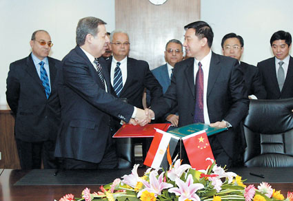 2月24日,国家质检总局局长王勇(前右一)会见了来访的埃及贸工部部长拉希德(前左一)一行。宾主就两国产品装运前检验合作、农产品贸易等问题进行了会谈。会谈结束后,王勇和拉希德共同签署了《中华人民共和国国家质量监督检验检疫总局与阿拉伯埃及共和国贸易工业部关于中国出口工业产品装运前检验谅解备忘录》。