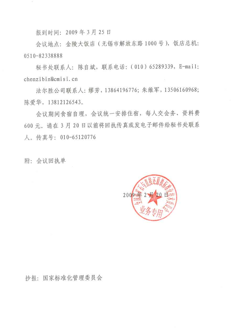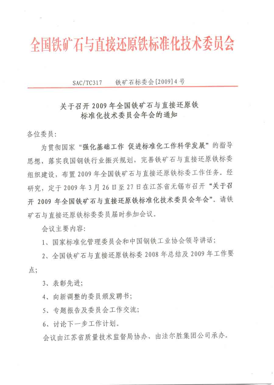2009年全国铁矿石与直接还原铁标委会召开年会通知