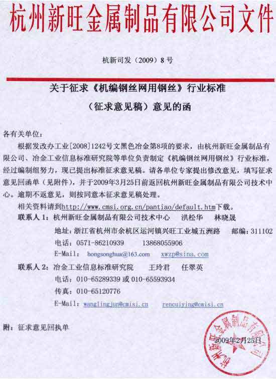 《机编钢丝网用钢丝》行业标准征求意见