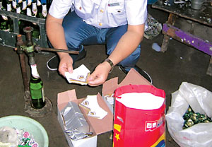 这家黑窝点位于海淀区明光村小区12号楼前的一个出租屋内。记者在现场看到,该出租屋内靠墙摆着多箱五星、青岛、燕京等品牌的啤酒。墙角有3个塑料大水箱,里面的水浑浊不堪,旁边还摆着一个压盖器。屋内的一名吴姓女子承认,他们以每箱20.5元的价格买来“五星”等比较便宜的啤酒,然后把外面的包装用水洗掉,贴上买来的假燕京啤酒标签,再把瓶盖取下,压上“燕京”的瓶盖,并以每箱29元到31元不等的价格,将这些经过“洗澡更衣”的假燕京啤酒卖出。从外观上看,这些假燕京啤酒很难看出破绽。这名吴姓女子声称自己还同时经销真燕京啤酒,“假的卖给周边的小商店和工地,真的卖给大饭店。”