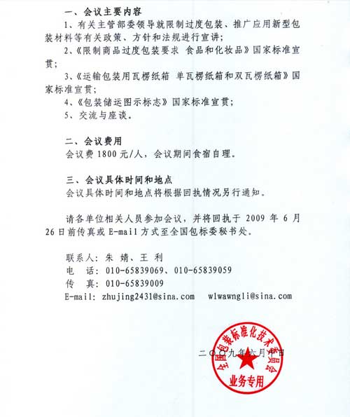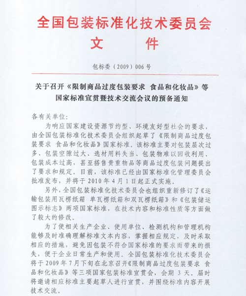 限制商品过度包装等国家标准宣贯暨技术交流会议的预通知