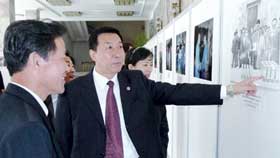 10月4日,国家质检总局局长王勇率团抵达朝鲜,与朝鲜国家质量管理局副局长朴成国共同签署了《中朝进出口商品联合检验协议》,并就双方关心的质检领域合作问题进行了会谈。图为10月5日,王勇在朴成国的陪同下,参观中朝友好60周年两国领导人活动图片展。