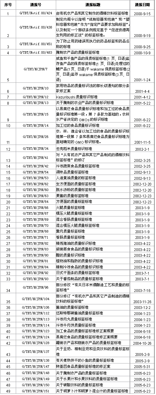 根据TBT通报,从2000年到2005年日本对食品质量标签或标识的修订情况如下: